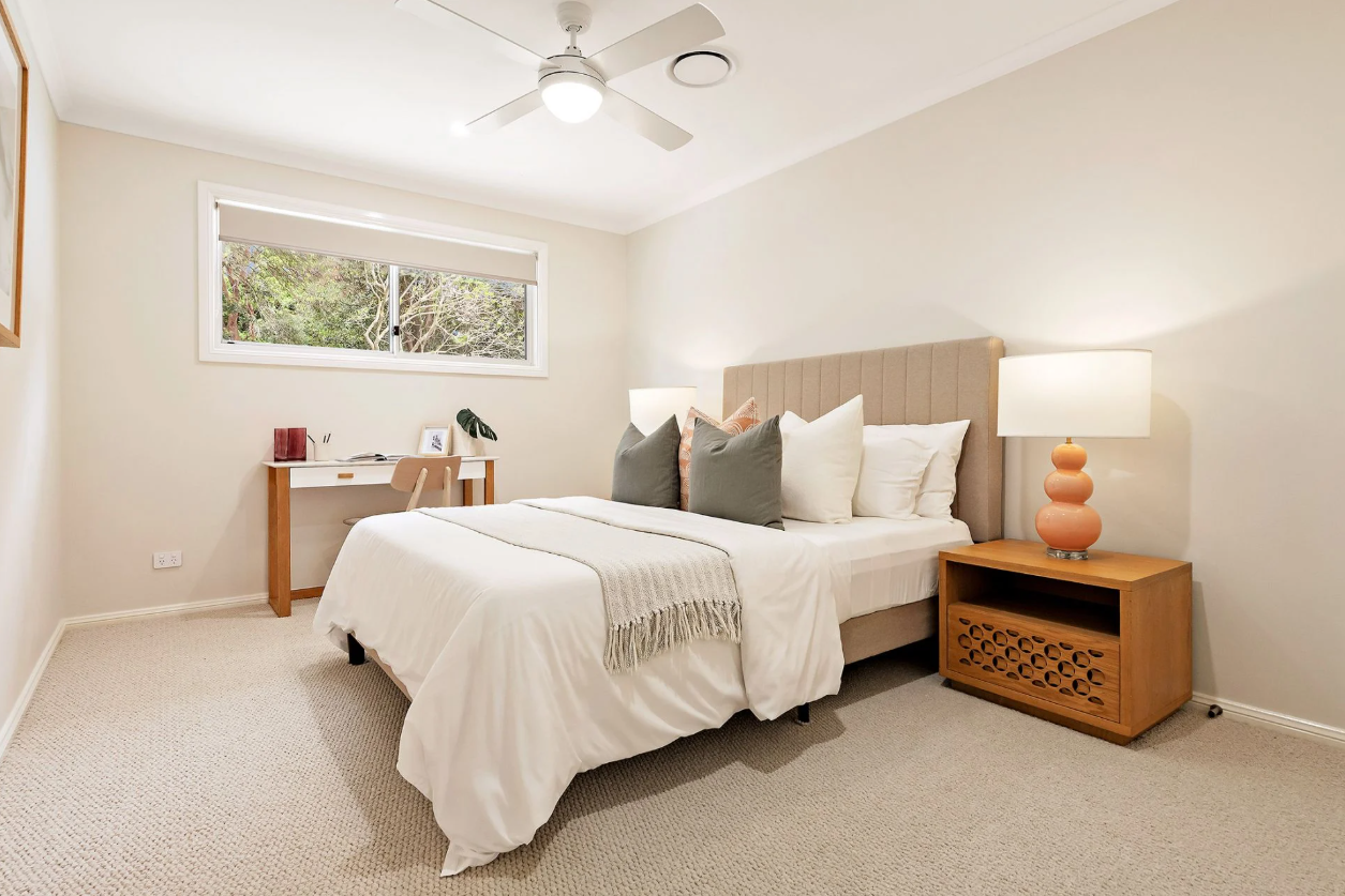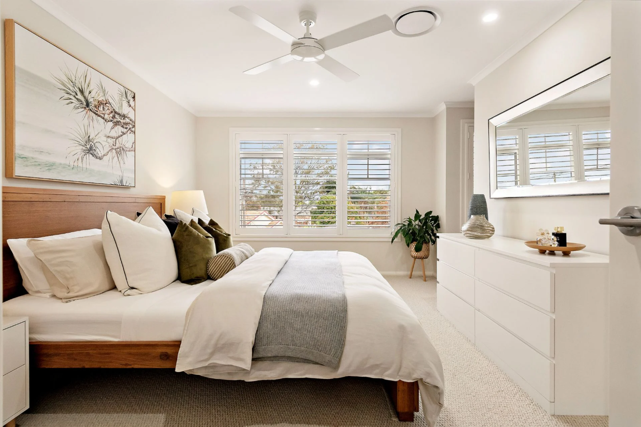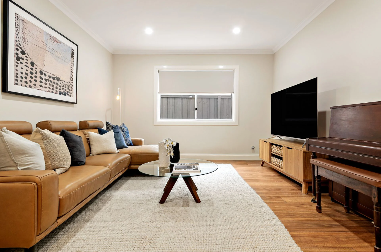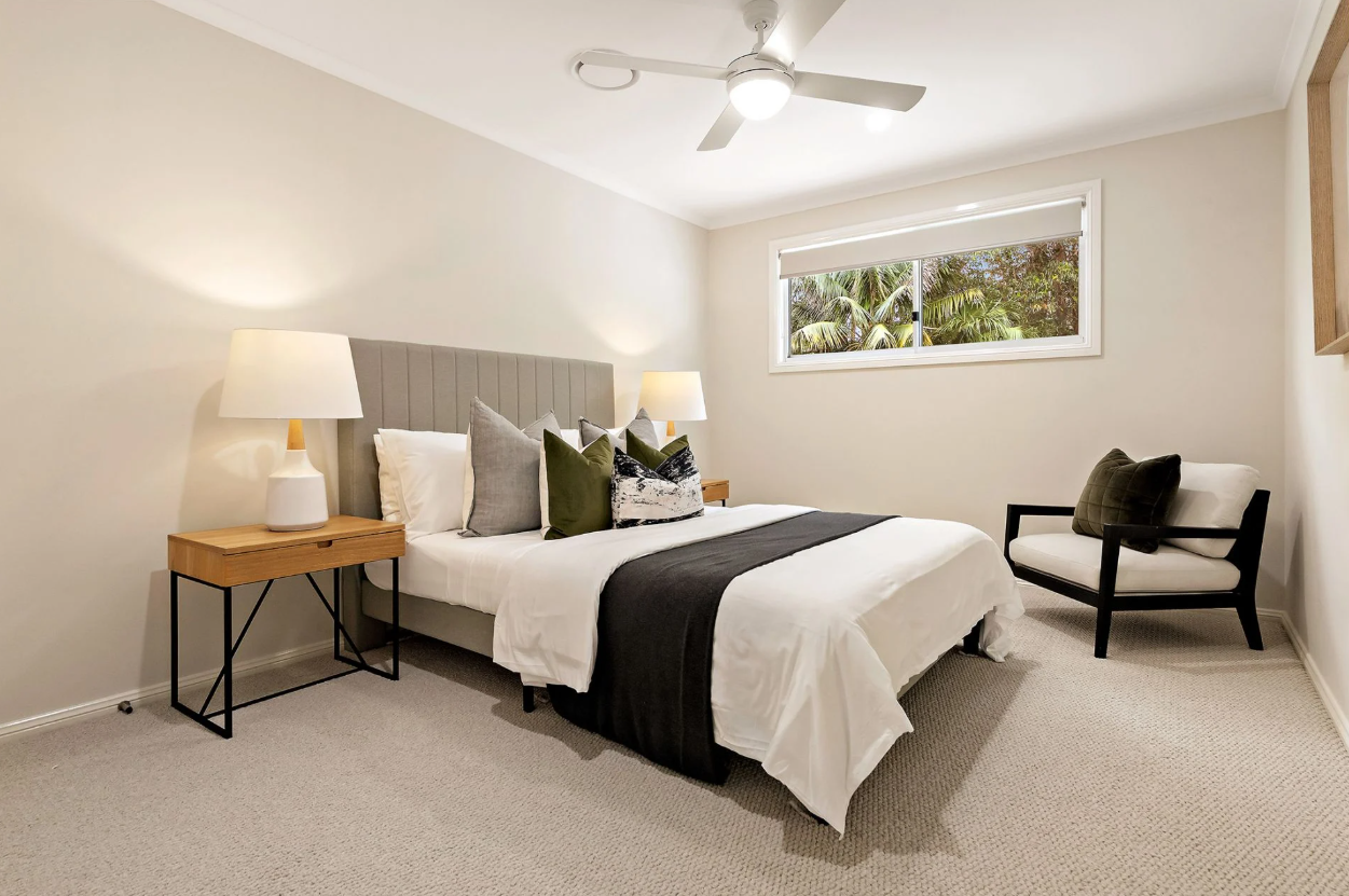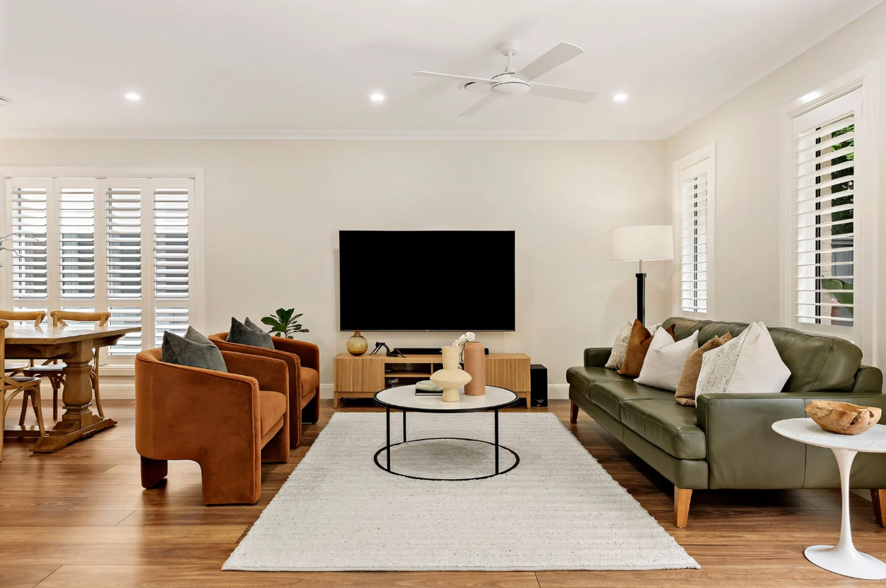 Each of the three generously sized bedrooms includes a built-in wardrobe, subtly integrated to maintain the home’s refined aesthetic. Our stylists intentionally used a calming combination of greens, blues, and oak tones, enhancing the tranquil atmosphere of the home. Timber floors run seamlessly throughout, complementing the rich and warm hues of the bespoke timber kitchen cabinetry and reinforcing the cohesive, stylish design.
