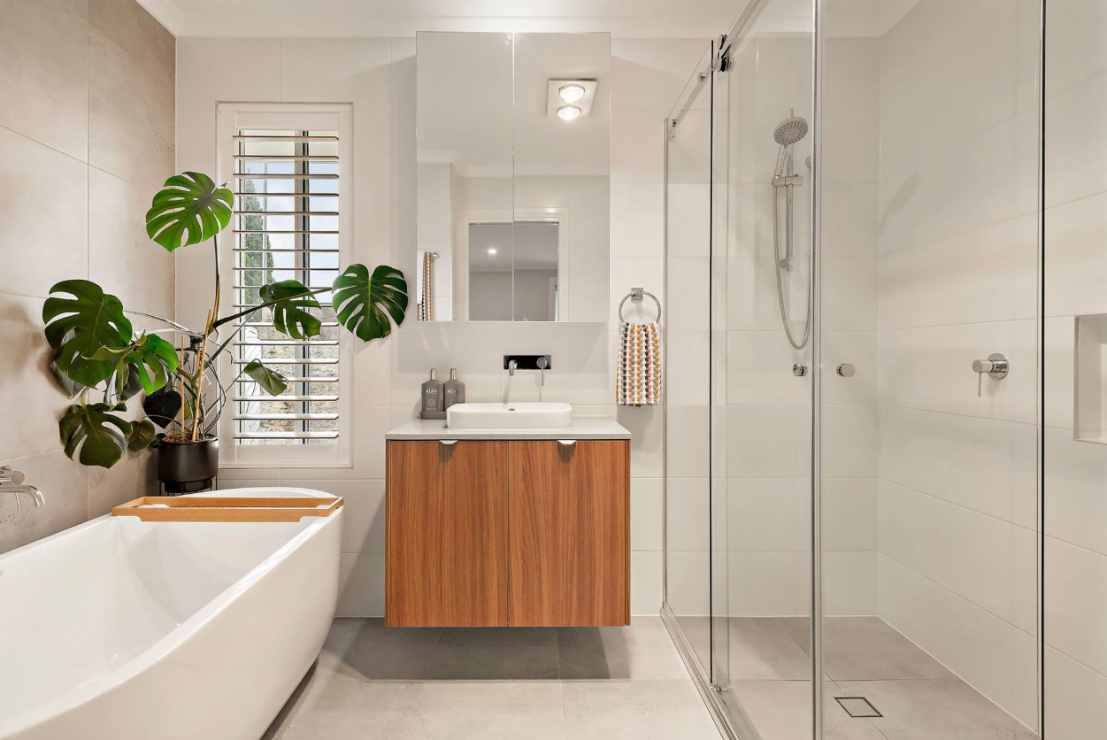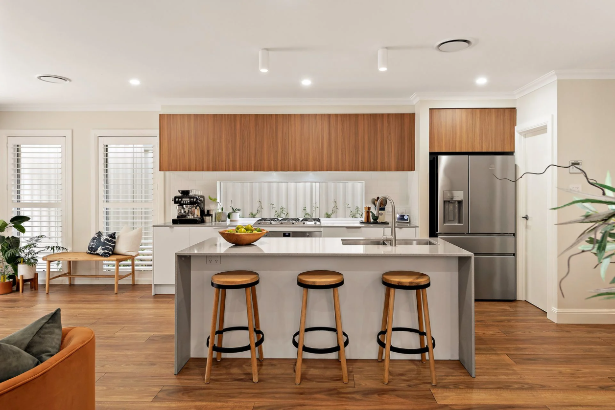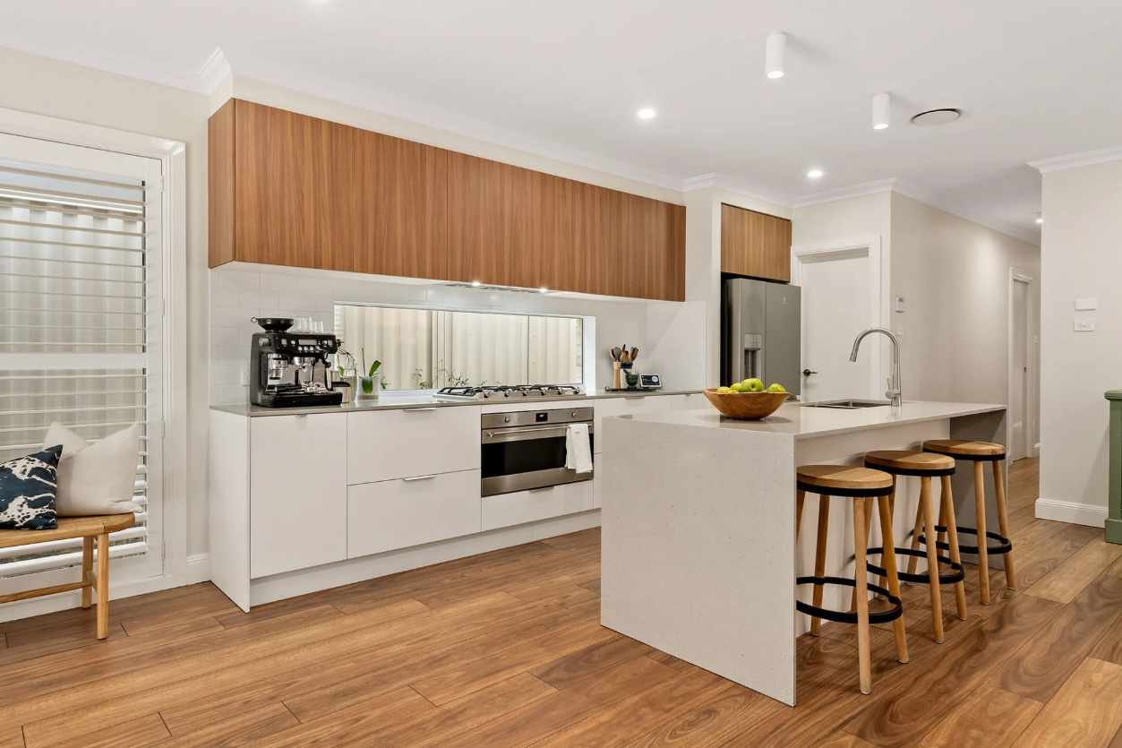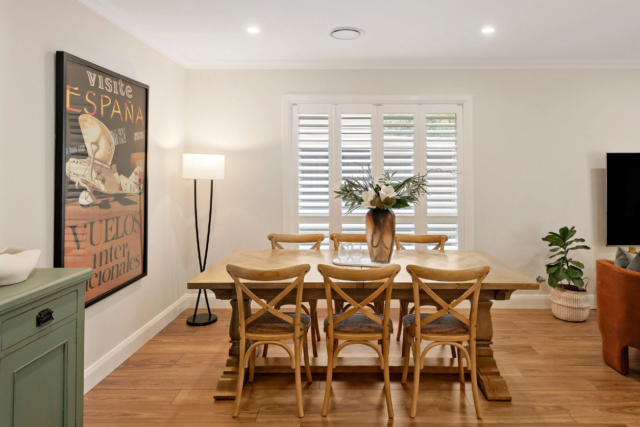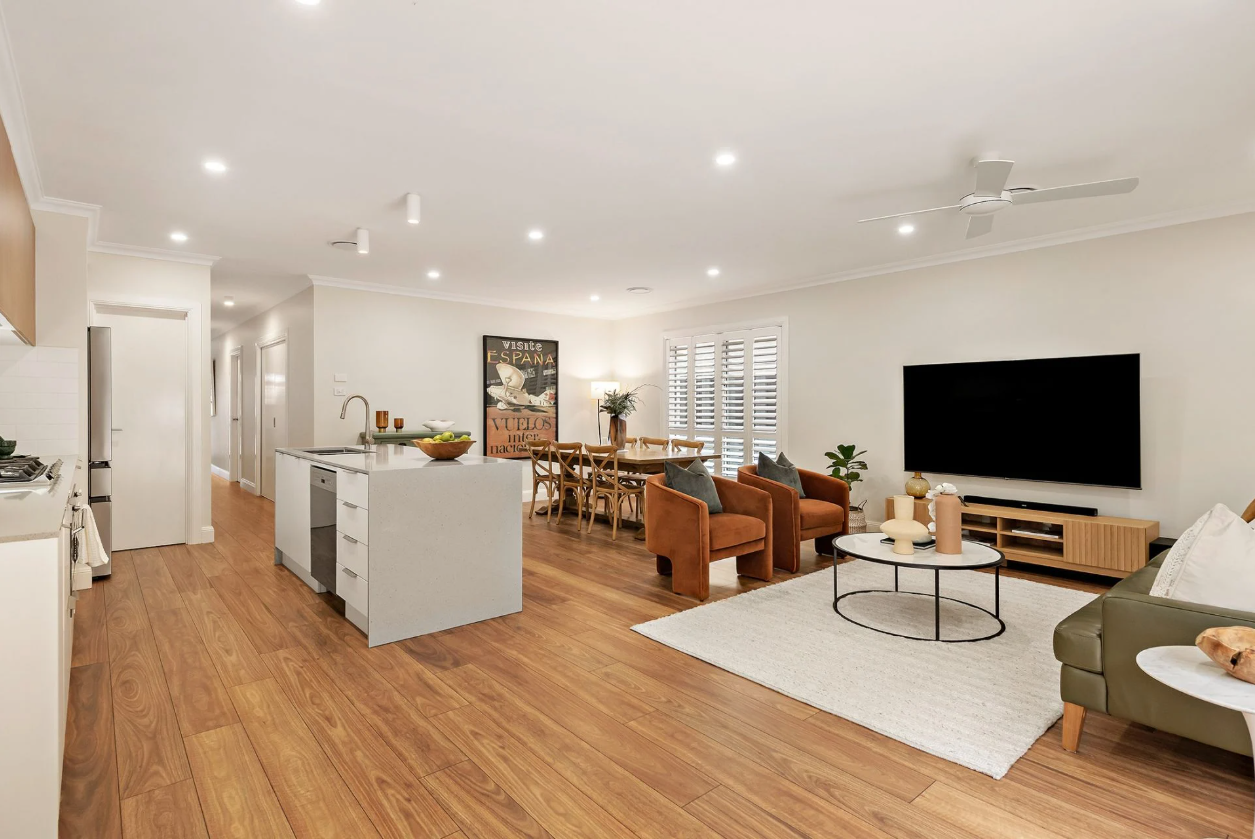 Each of the three generously sized bedrooms includes a built-in wardrobe, subtly integrated to maintain the home’s refined aesthetic. Our stylists intentionally used a calming combination of greens, blues, and oak tones, enhancing the tranquil atmosphere of the home. Timber floors run seamlessly throughout, complementing the rich and warm hues of the bespoke timber kitchen cabinetry and reinforcing the cohesive, stylish design.