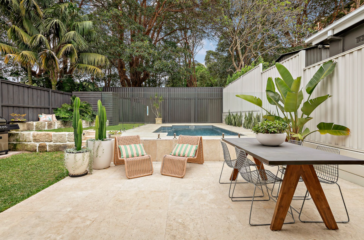 This beautifully curated home offers a resort-style experience right in your own backyard. Framed by elegant travertine tiles, the alfresco entertaining area seamlessly blends dining and relaxation. Stepping out into the backyard is like being transported to a private island retreat, complete with a crystal-blue heated in-ground swimming pool, a built-in barbecue, and a lush landscape of tropical plants and vibrant green grass.